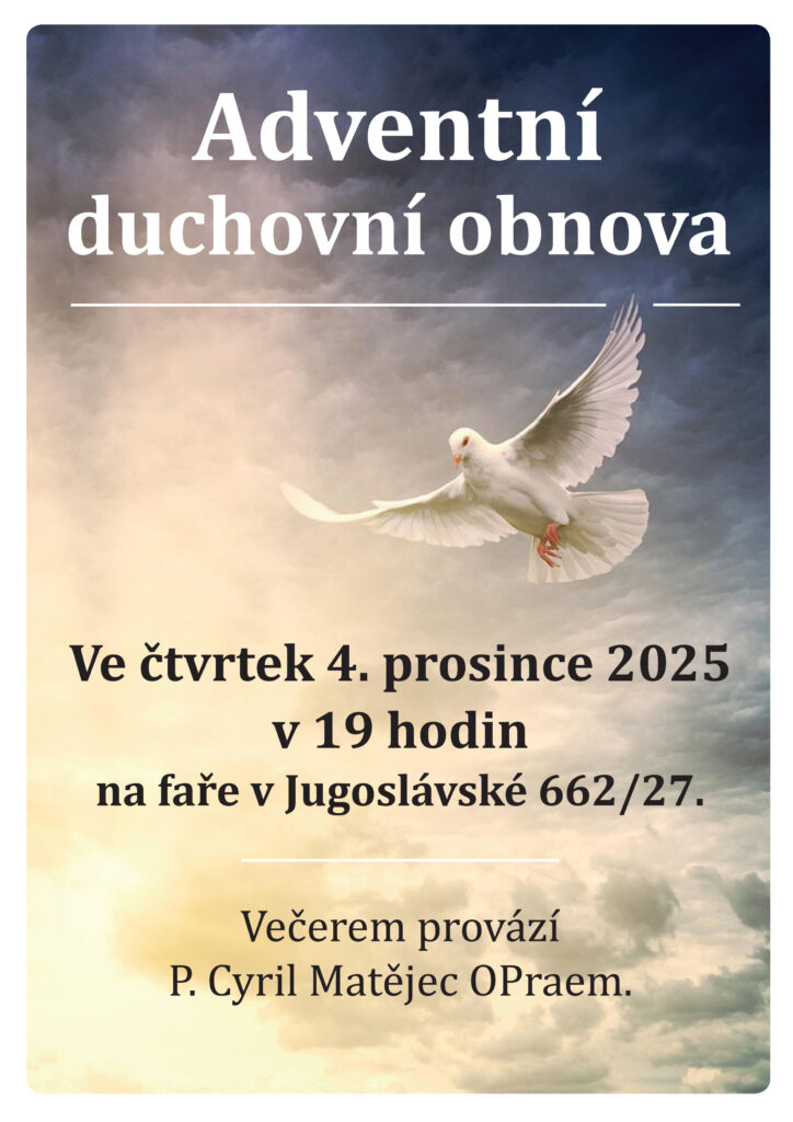 Srdečně vás zveme na Adventní duchovní obnovu ve čtvrtek 4. prosince 2025 v 19 hodin, která se koná na faře v Jugoslávské 662/27, Praha 2.