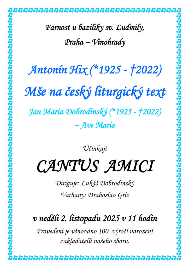Zazní Mše na český liturgický text od Antonína Hixe (*1925 – †2022) a Ave Maria od Jana Maria Dobrodinského (*1925 – †2022).
