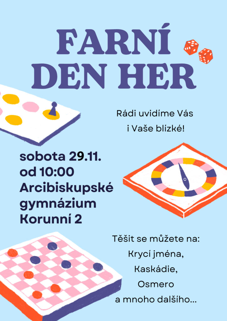 Srdečně Vás zveme v sobotu 29. listopadu 2025 od 10 hodin na Farní den her do Arcibiskupského gymnázia v Praze (Korunní 2, Praha 2, poblíž baziliky sv. Ludmily).