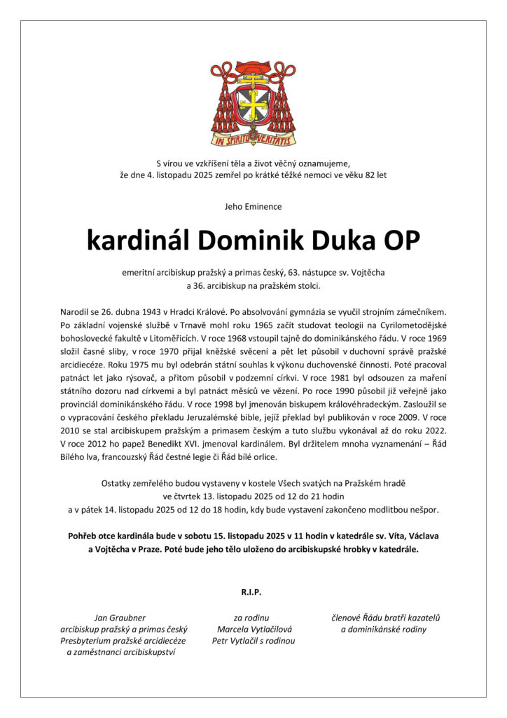 S vírou ve vzkříšení těla a život věčný oznamujeme, že dne 4. listopadu 2025 zemřel po krátké těžké nemoci ve věku 82 let Jeho Eminence kardinál Dominik Duka OP, emeritní arcibiskup pražský a primas český, 63. nástupce sv. Vojtěcha a 36. arcibiskup na pražském stolci.