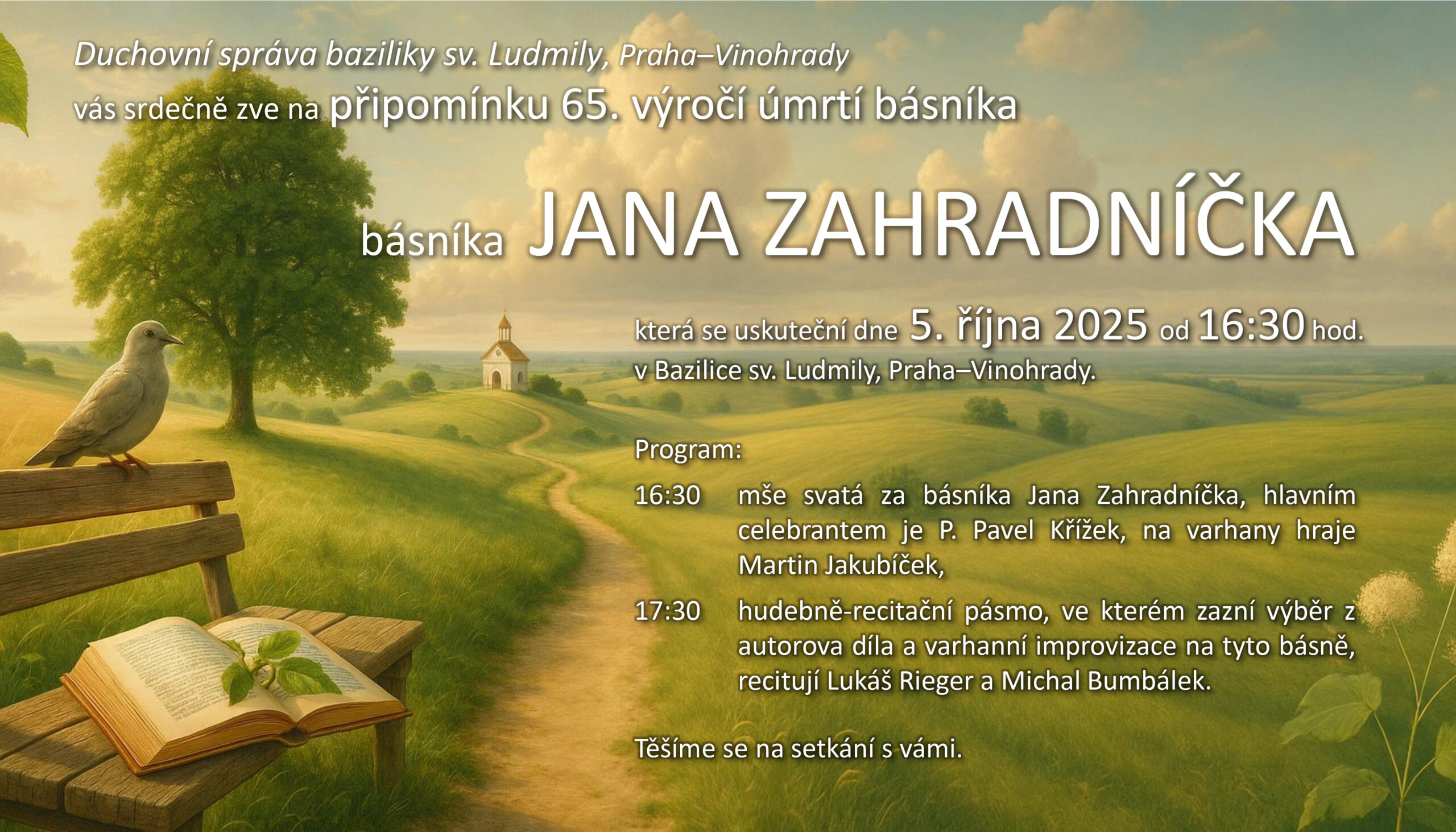 Duchovní správa baziliky sv. Ludmily, Praha–Vinohrady vás srdečně zve na připomínku 65. výročí úmrtí básníka Jana Zahradníčka, která se uskuteční dne 5. října 2025 od 16.30 hod. v Bazilice sv. Ludmily, Praha–Vinohrady.